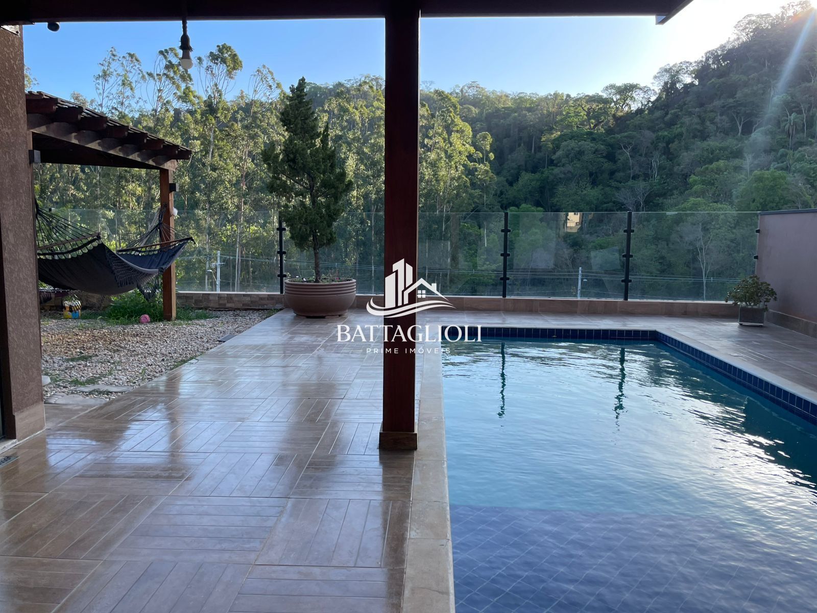 Está casa possui uma conexão incrível com a Natureza , sua área de lazer com uma confortável piscina se integra a paisagem verde ao fundo que emoldura esse ambiente .